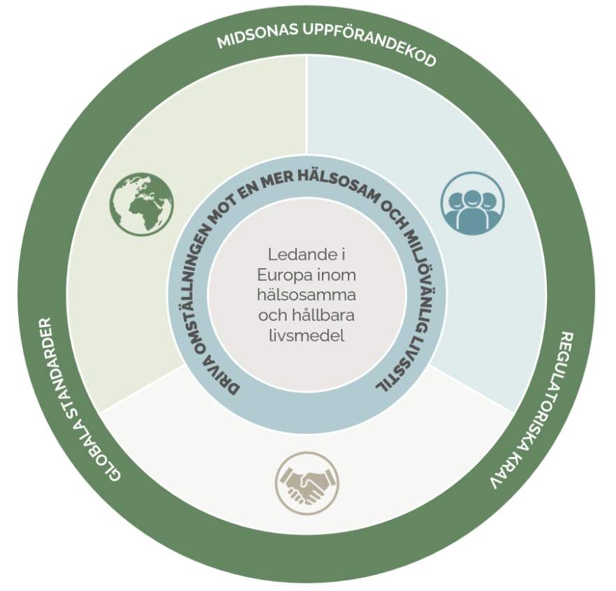 Ramverket har utformats med stöd i globalt erkända standarder i kombination med Midsonas strategi för att skapa värde för människor, planeten och våra aktieägare. Genom att integrera hållbarhet i vår affärsplanering skapar vi förutsättningar för lönsam och hållbar tillväxt samtidigt som vi driver på övergången mot hälsosammare och mer miljövänliga livsstilar.